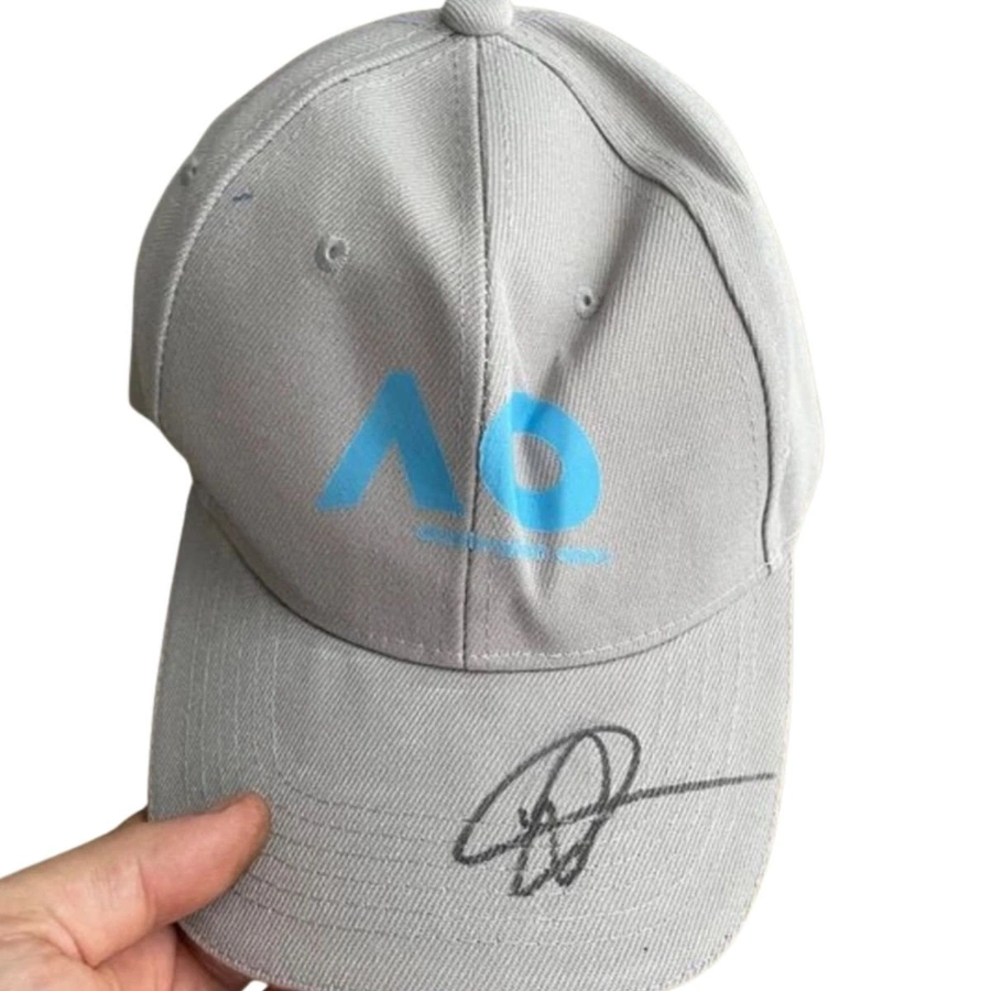 Cappellino grigio ufficiale della competizione dell'Australian Open autografato da Novak Djokovic.
