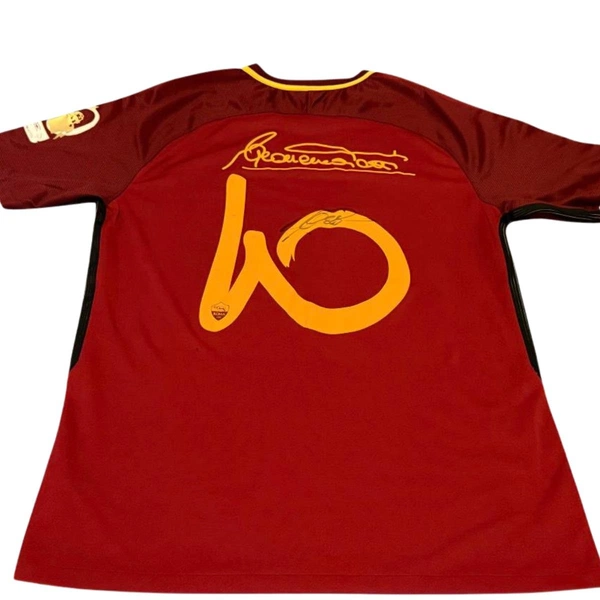 Il 28 maggio 2017, in occasione di AS Roma–Genoa, Francesco Totti ha disputato l’ultima partita della sua straordinaria carriera. Dopo 25 anni trascorsi con un’unica maglia, quella della Roma, ha chiuso il suo percorso da calciatore con 786 presenze e 307 gol, tutti realizzati con il club capitolino. Questa maglia è stata utilizzata per celebrare il suo addio al calcio e alla Roma, rendendo omaggio a uno dei più grandi giocatori della storia. In quel pomeriggio carico di emozione, al fischio finale, tutti i giocatori indossarono questa maglia per onorarlo, trasformandola in un simbolo indelebile di una carriera leggendaria e di un amore eterno per la stessa squadra.