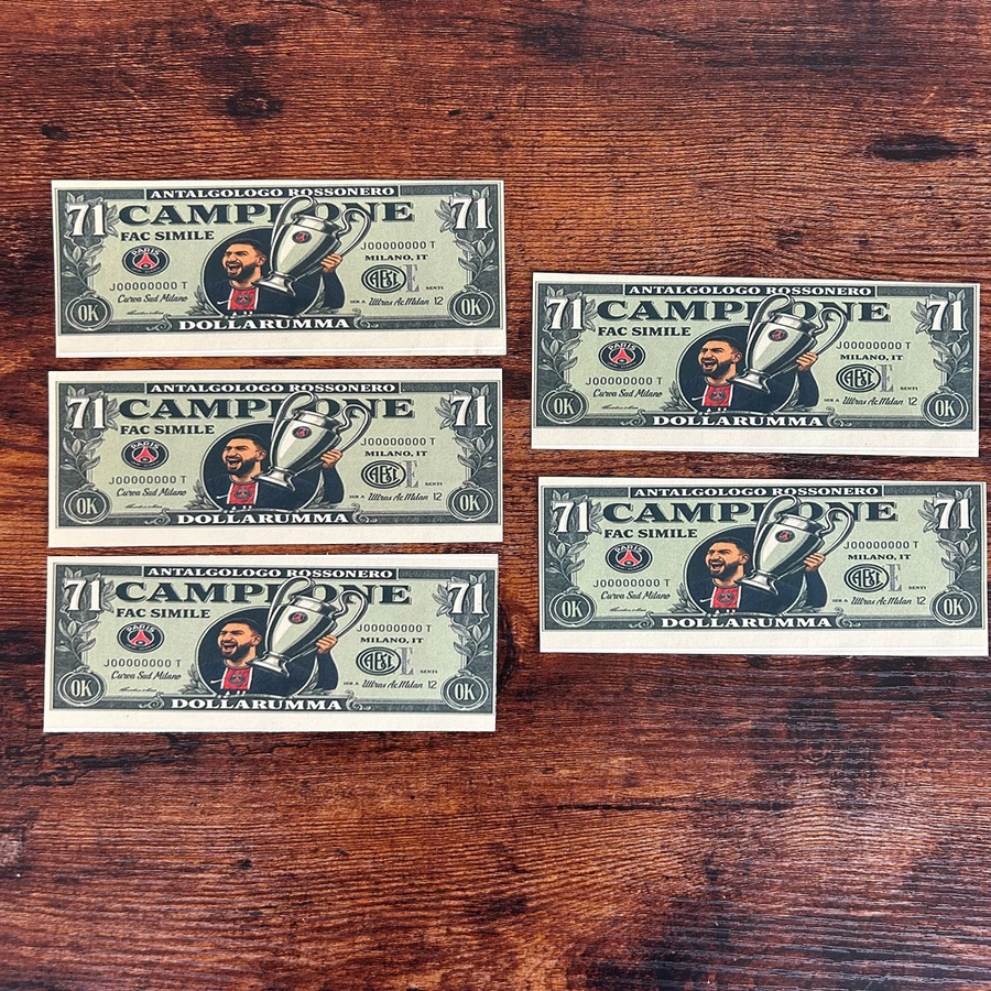 Cinque ‘dollarumma’, le banconote false stampate dai tifosi del Milan stampate in occasione del match contro il PSG.