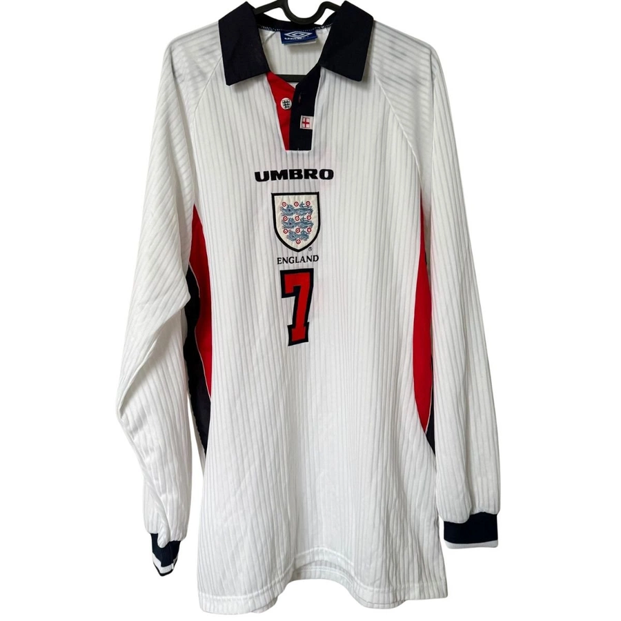 Questa maglia testimonia il periodo in cui David Beckham stava emergendo come uno dei talenti più brillanti del calcio europeo. In quella fase della sua carriera, Beckham non era ancora un’icona globale, ma già incarnava il futuro dei Three Lions. Negli anni successivi si affermò come punto fermo dell’Inghilterra grazie alla sua straordinaria precisione nei calci piazzati, alla qualità nei cross e alla personalità mostrata in campo.