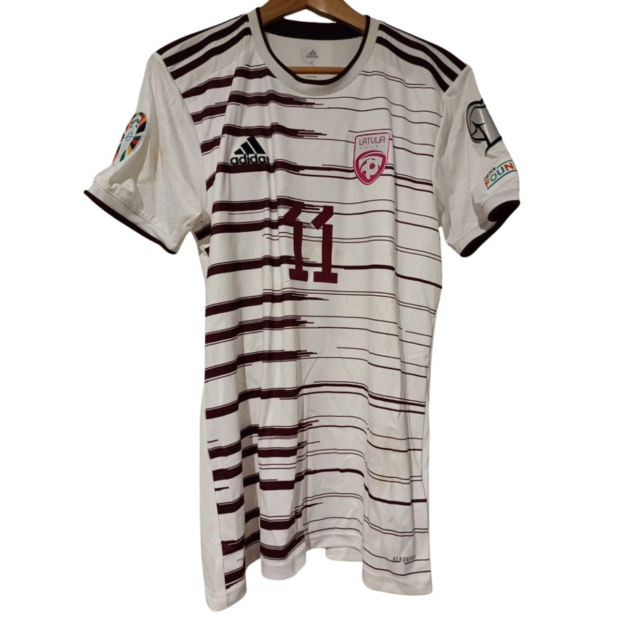 Maglia gara della Lettonia indossata da Savalnieks nella partita contro la Turchia giocata il 15/10/2023, valida per le qualificazioni a Euro 2024.