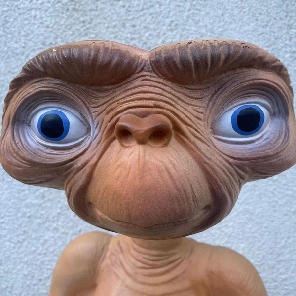 La riproduzione di E.T. è realizzata in modo fedele al celebre personaggio del film, con colorazione marrone/beige e pelle rugosa ricca di pieghe e venature, testa grande e arrotondata con occhi enormi azzurri/blu molto espressivi, corpo con busto ampio e braccia lunghe con mani grandi e dita allungate, dettaglio della punta del dito colorata di rosso che richiama la scena iconica dell’illuminazione, firma in pennarello nero ben visibile sul ventre e foto prova presente in gallery che valorizza ulteriormente il pezzo come oggetto da collezione.