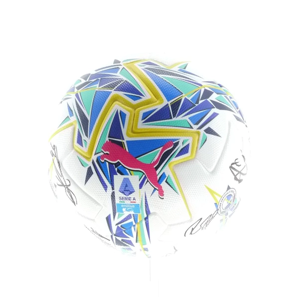 Il pallone autografato è il modello bianco del pallone ufficiale della Serie A invernale arancione, cambiato da poche gare di Serie A.