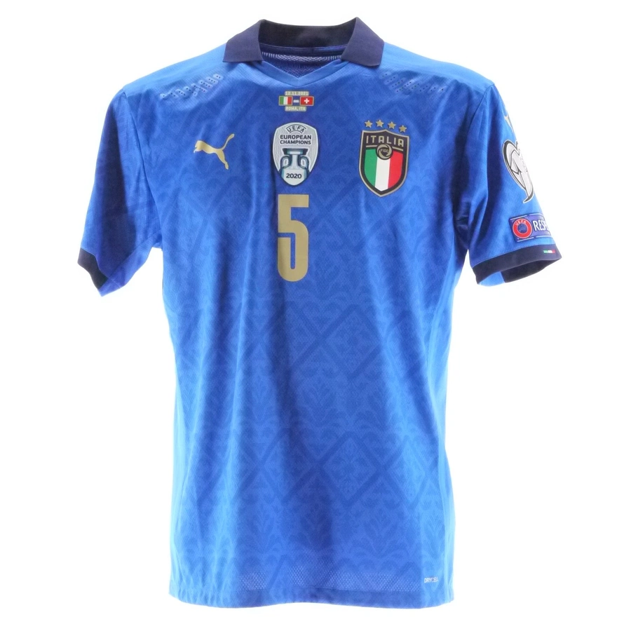 La maglia gara dell'Italia indossata da Locatelli nella partita contro la Svizzera giocata il 12/11/2021, valida per le qualificazioni ai Mondiali 2022.