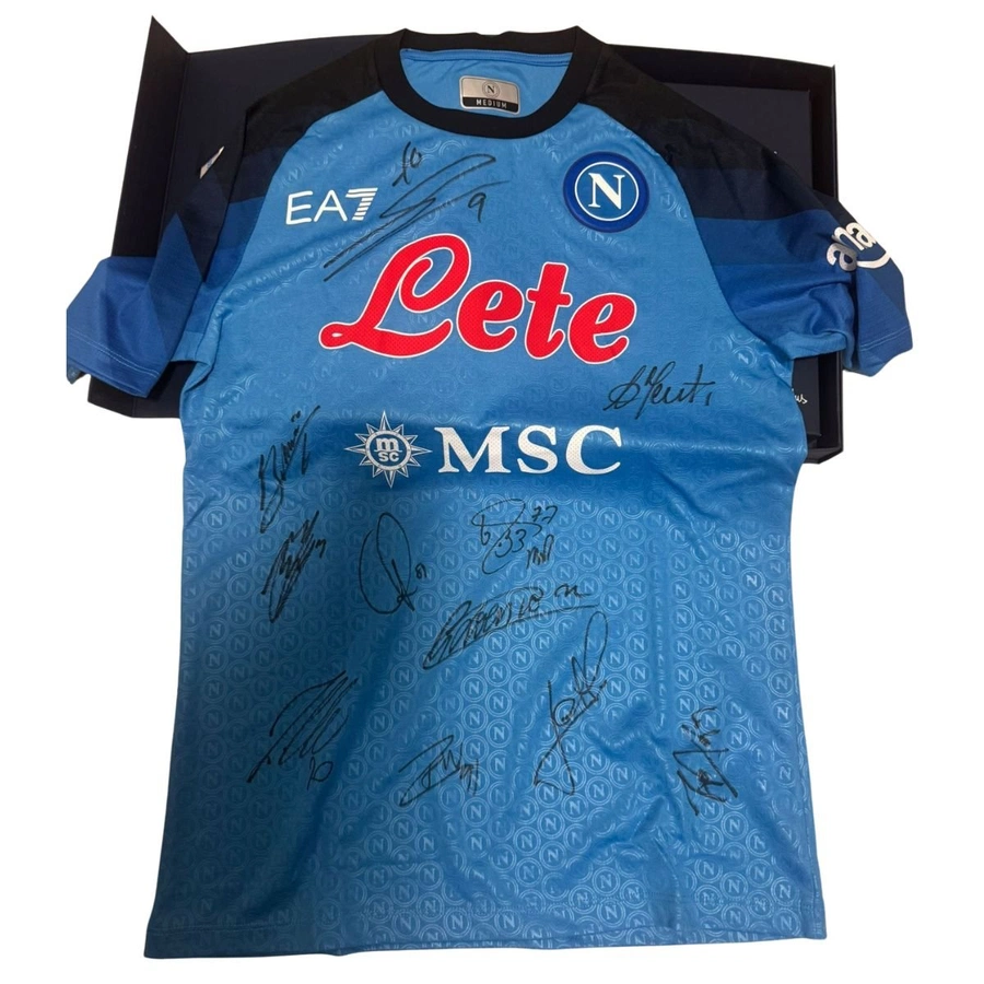 La maglia è autografata da diversi giocatori della rosa, tra cui Zielinski, Kvaratskhelia, Ndombele, Kim, Osimhen.