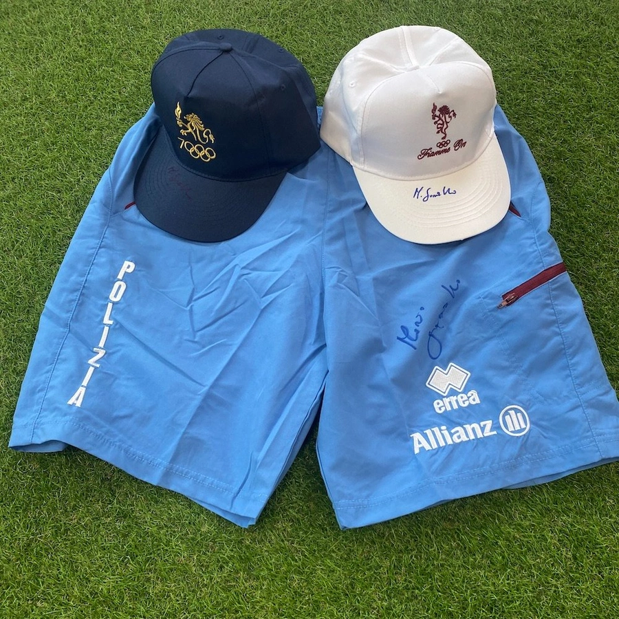 Il lotto comprende anche i cappellini blu e bianco delle Fiamme Oro autografati da Mario Sanzullo.