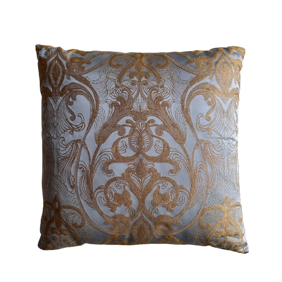Cuscini realizzati con tessuto Jaipur, con prezioso jaquard di seta. Ha l'aspetto di un disegno classico occidentale, ma in realtà riproduce il motivo decorativo architettonico di antichissimi templi dell'India meridionale, segnando così un punto d'incontro tra Oriente e Occidente.