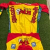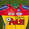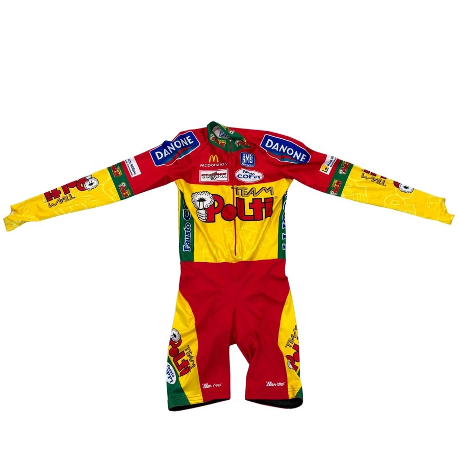 Time trial skinsuit from Team Polti, with co-sponsors Danone and McDonald’s, dating back to 1996. This is a suit used in individual time trials, a key discipline in major stage races.
