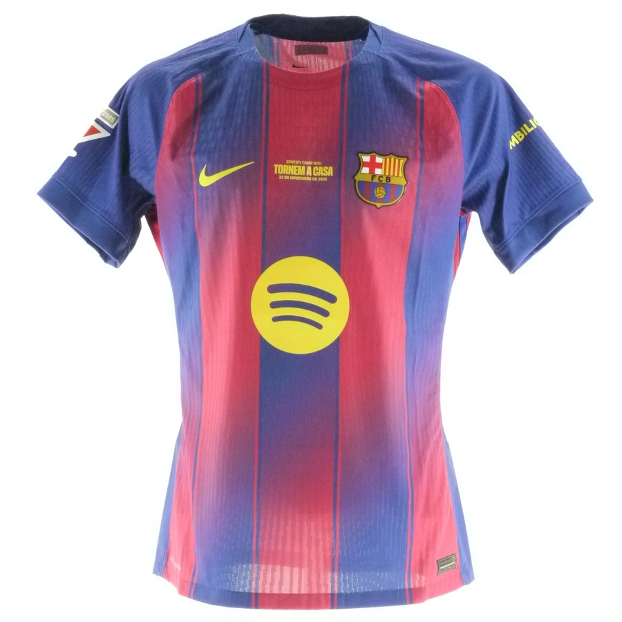 The shirt features a special patch on the chest to celebrate Barcelona’s return to the Spotify Camp Nou, bearing the words “Tornem a Casa” (“We’re back home”), a symbol of a long-awaited comeback after more than 900 days during which the blaugrana were forced to play away from their historic stadium due to renovation works.