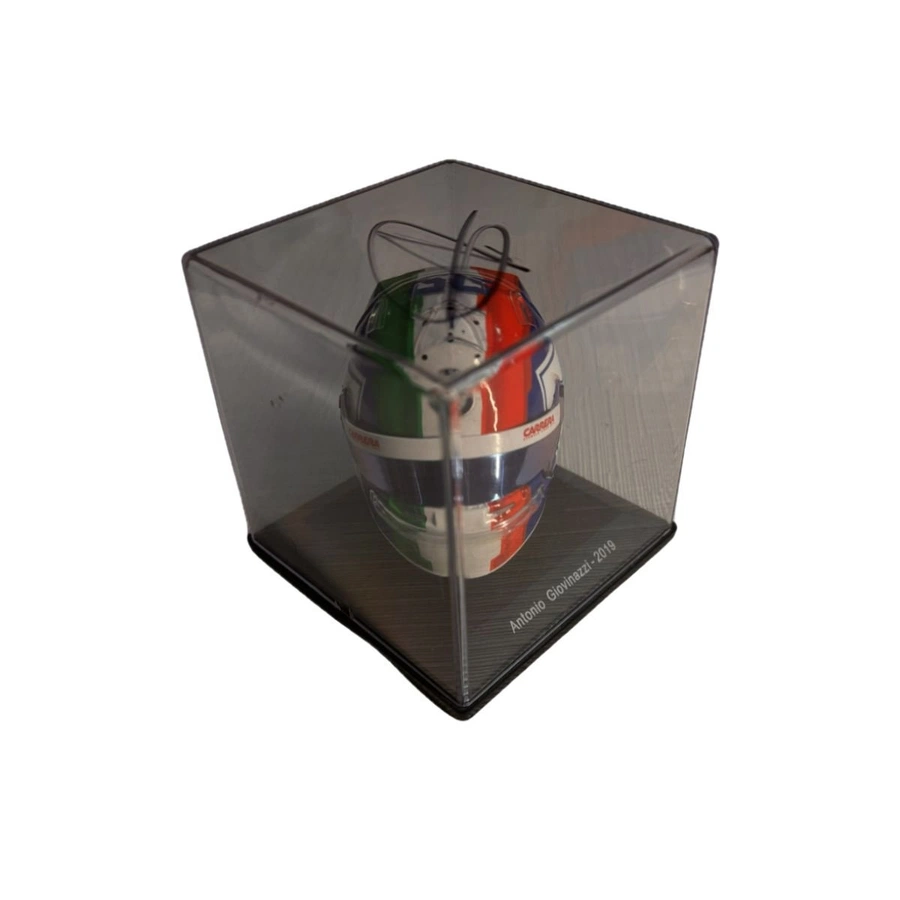 It is a miniature replica of the helmet worn by Antonio Giovinazzi during the 2019 Formula 1 season with Alfa Romeo, his first full year in the top category. That season he contested 21 races, finishing 17th in the overall standings with 14 points, and achieving his best result with a 5th place at the Brazilian Grand Prix.