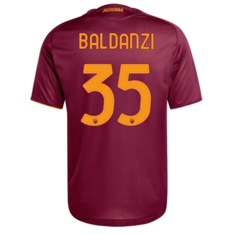La maglia store della Roma, stagione 2025/26, personalizzata con nome e numero di Baldanzi, autografata e con dedica personalizzata.