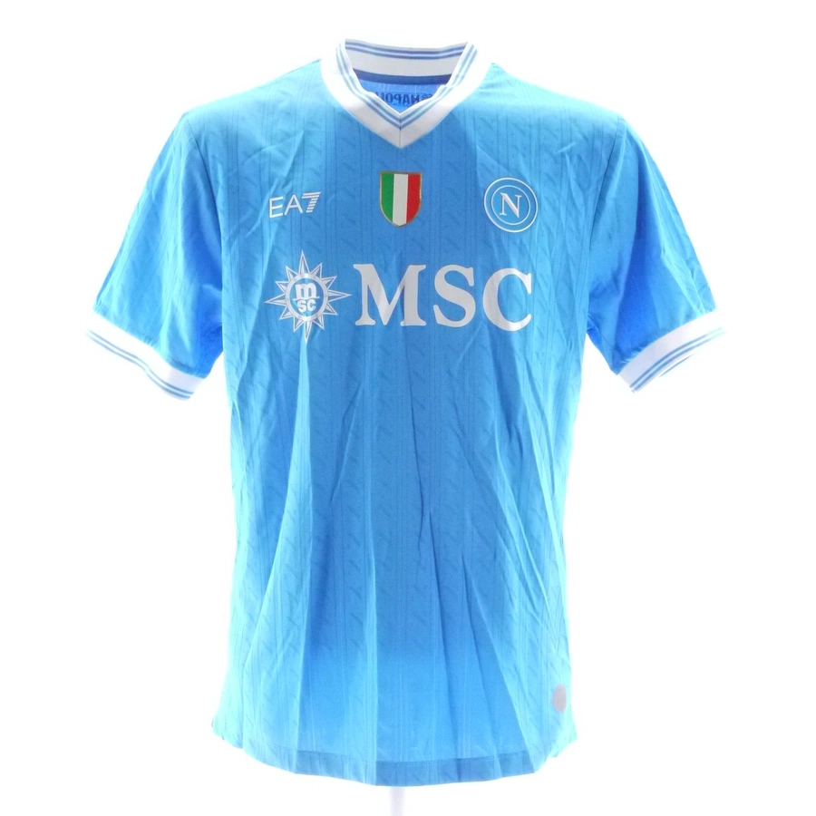 La maglia gara del Napoli indossata da Di Lorenzo in occasione della partita amichevole contro il Brest giocata il 03/08/25, stagione 2025/26.