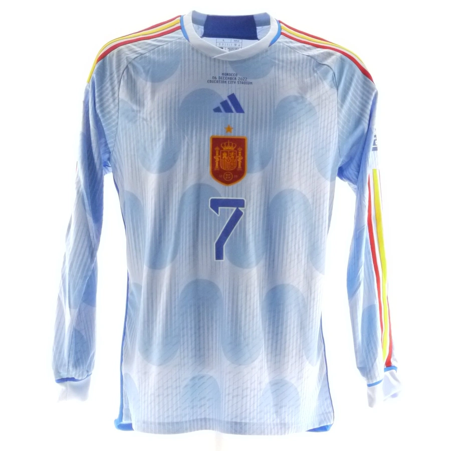 La maglia gara della Spagna preparata/indossata da Alvaro Morata in occasione della partita contro il Marocco giocata il 06/12/2022 valida per gli ottavi di finale del Mondiale disputato in Qatar nella stagione 2022.