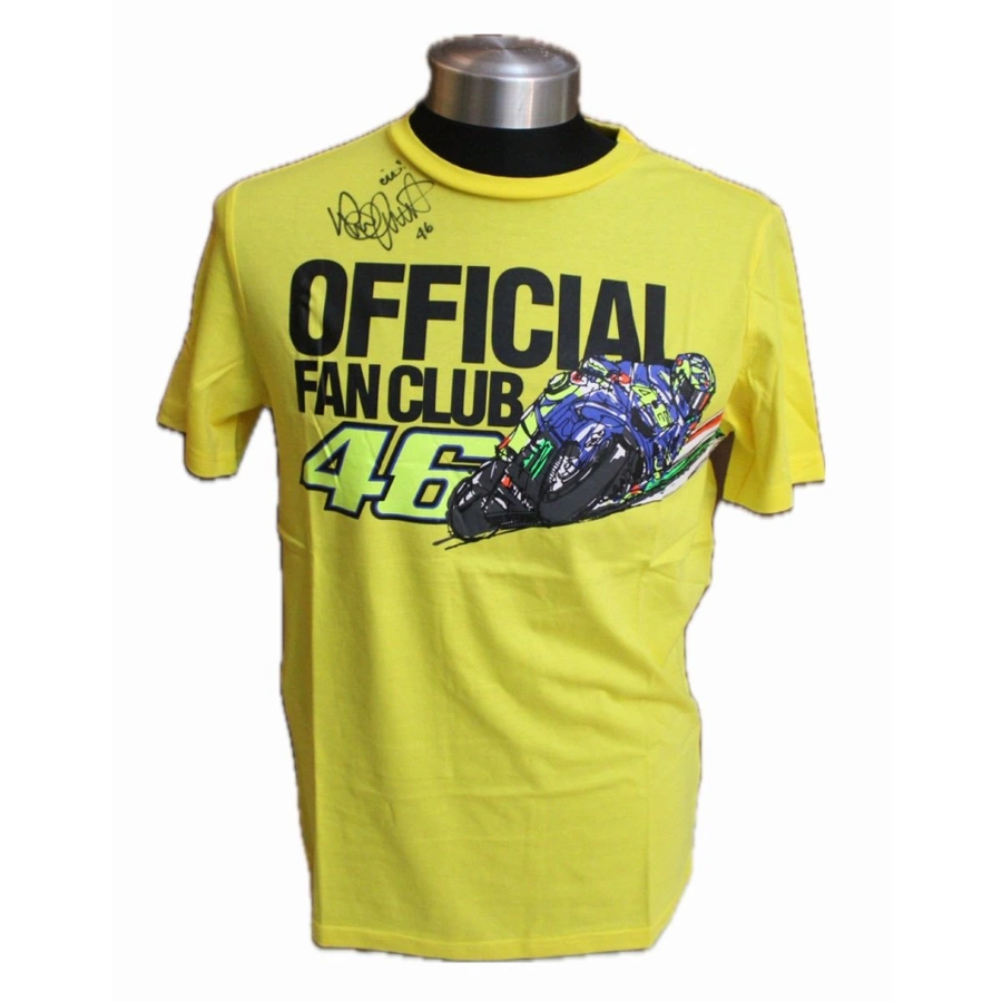 La maglia è di colore giallo, una tonalità iconica e immediatamente riconducibile a Valentino Rossi, che lo ha accompagnato costantemente lungo tutta la sua carriera, diventando un simbolo della sua identità sportiva e del suo stile inconfondibile.