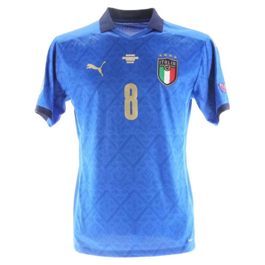 La maglia gara dell'Italia preparata / indossata da Jorginho in occasione della semifinale di Euro2020, giocata il 06/07/2022, giocata contro la Spagna.