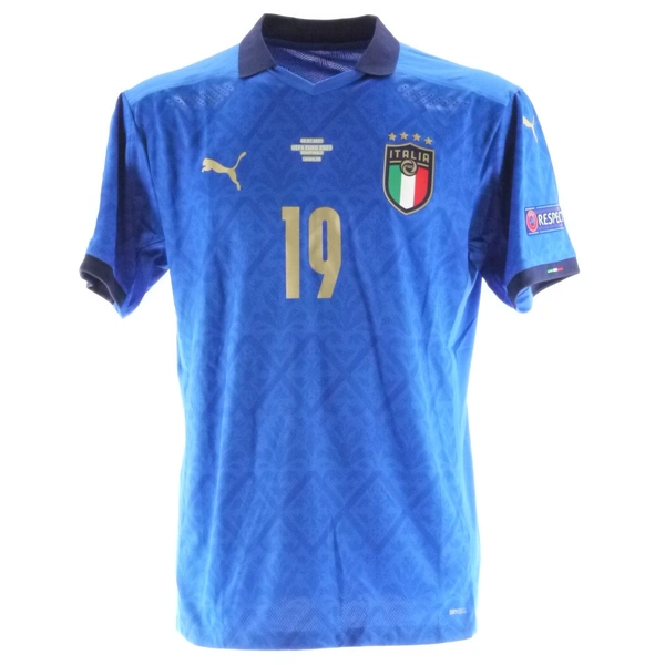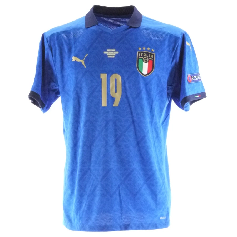 Maglia gara dell'Italia preparata / indossata da Bonucci in occasione della semifinale degli Europei 2020 contro la Spagna giocata il 06/07/2021 allo stadio di Wembley a Londra, stagione 2020/21.
