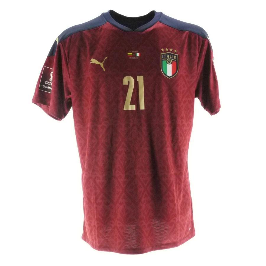 La maglia gara dell'Italia preparata / indossata da Donnarumma nella partita contro la Lituania giocata il 31/03/2021 a Vilnius, valida per le qualificazioni al Mondiale di Qatar 2022
