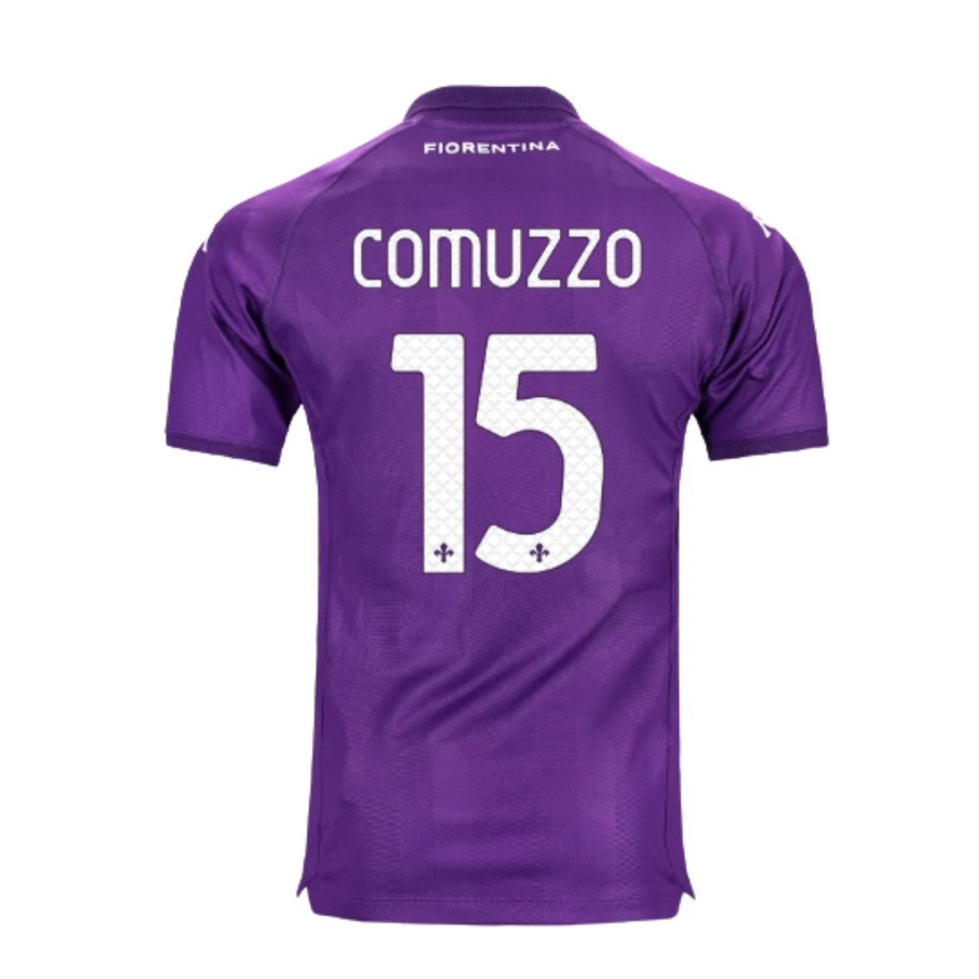 La maglia store della Fiorentina, stagione 2024/25, personalizzata con nome e numero di Comuzzo autografata e con dedica personalizzata.