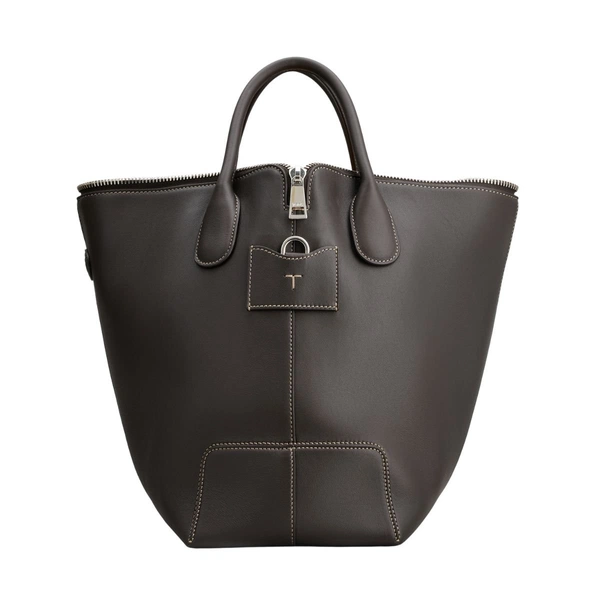 La Tod's Di Bag Swing offre una reinterpretazione contemporanea dell'iconico modello della maison, giocando con volumi dinamici e linee in movimento. Il suo design unico prevede una parte frontale che, a seconda di come viene indossata, si trasforma nel fianco della borsa, donando versatilità alla forma. Rifinita con impuntura a T su un lato e l'emblematico logo ovale Tod’s sull’altro, è dotata di due manici tubolari e di una tracolla in pelle removibile, per una portabilità personalizzabile. La chiusura con zip a doppio cursore, completata da automatici interni, assicura praticità e stile in ogni occasione.